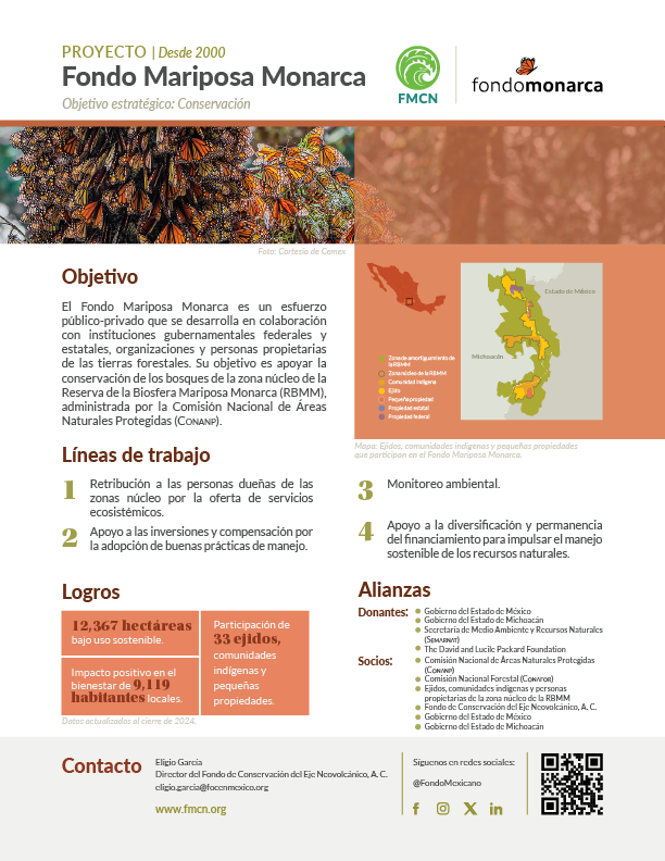 The project's achievements are the result of the coordinated work of the federal environmental authority, the governments of the State of Mexico and Michoacán, FMCN, WWF, ejidos, indigenous communities, and landowners in the core areas who collaborate with the operation of the Monarch Butterfly Fund and concurrent funds to increment the payment per hectare conserved in the core zone of the RBMM.